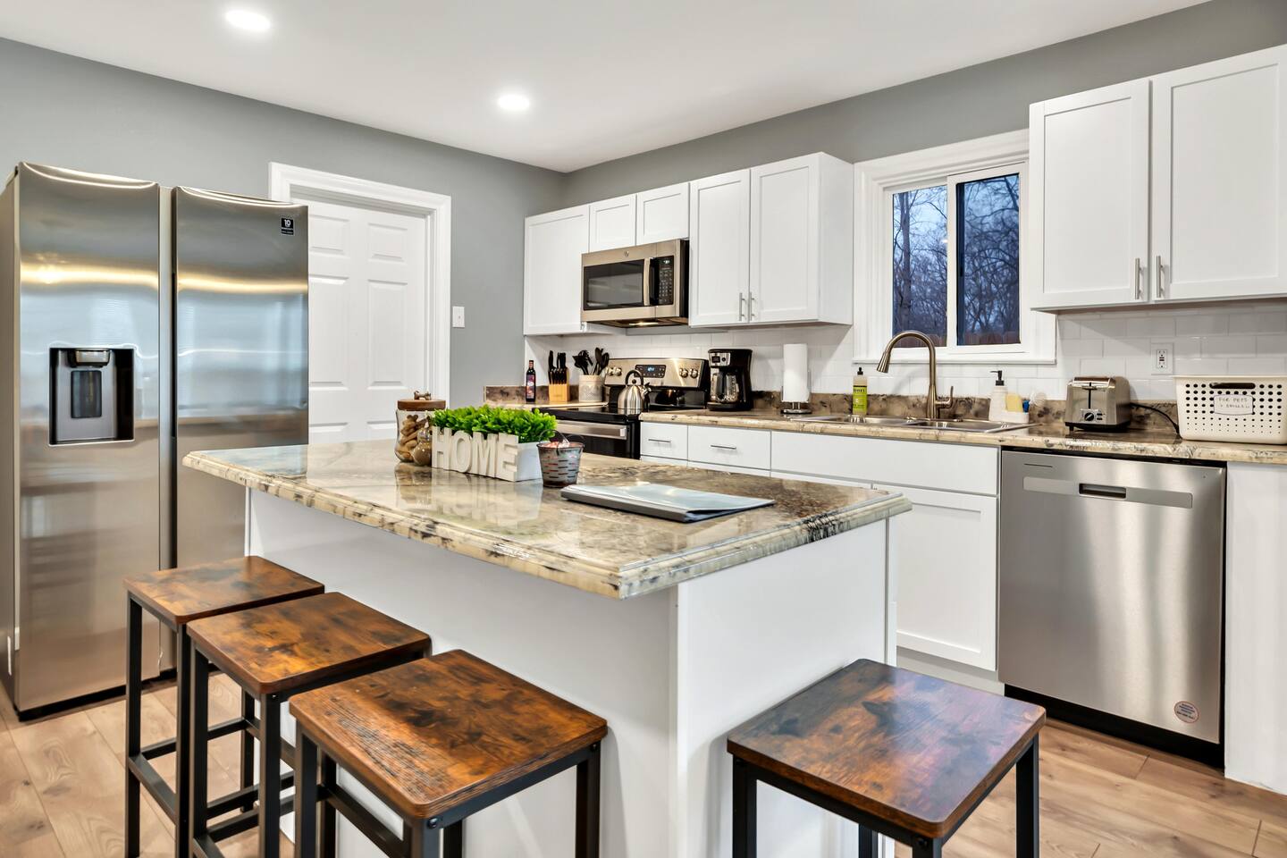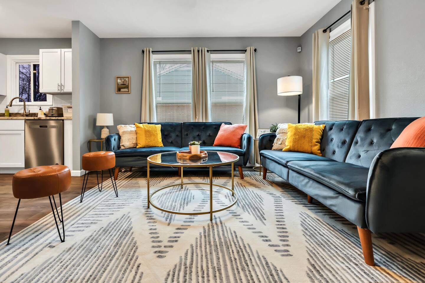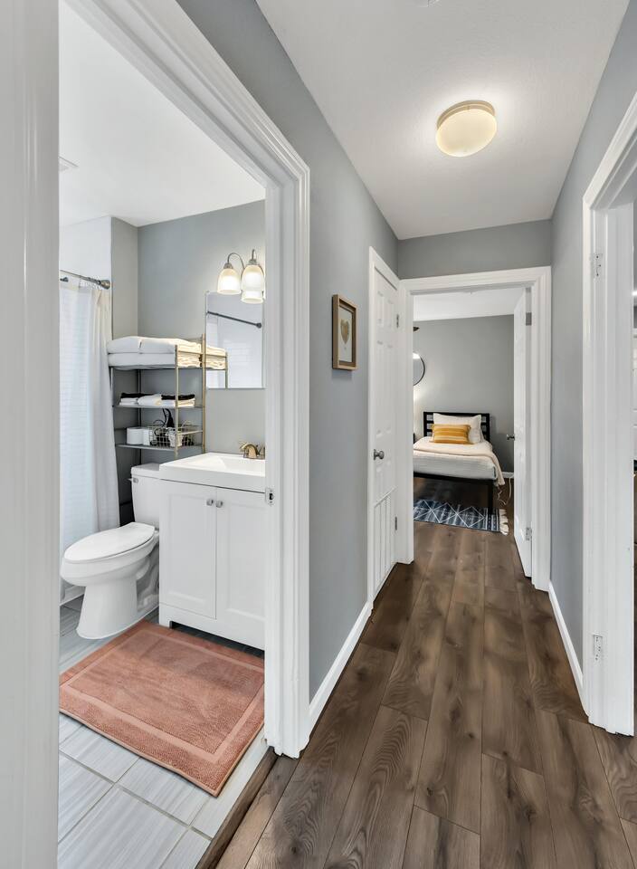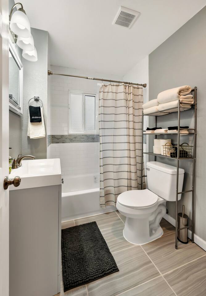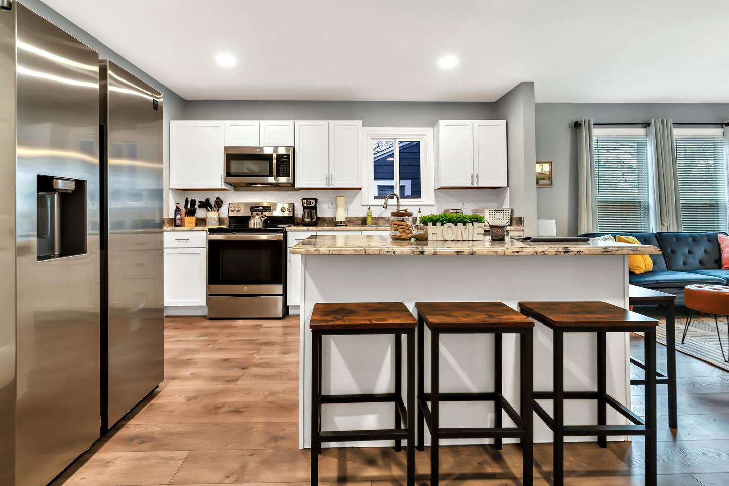 1,428 sq ft stylish 3 bedroom 2 bathroom home perfect for both small and larger groups. If any extra sleeping space is needed, the two couches in the living room fold down to beds and an air mattress is provided.