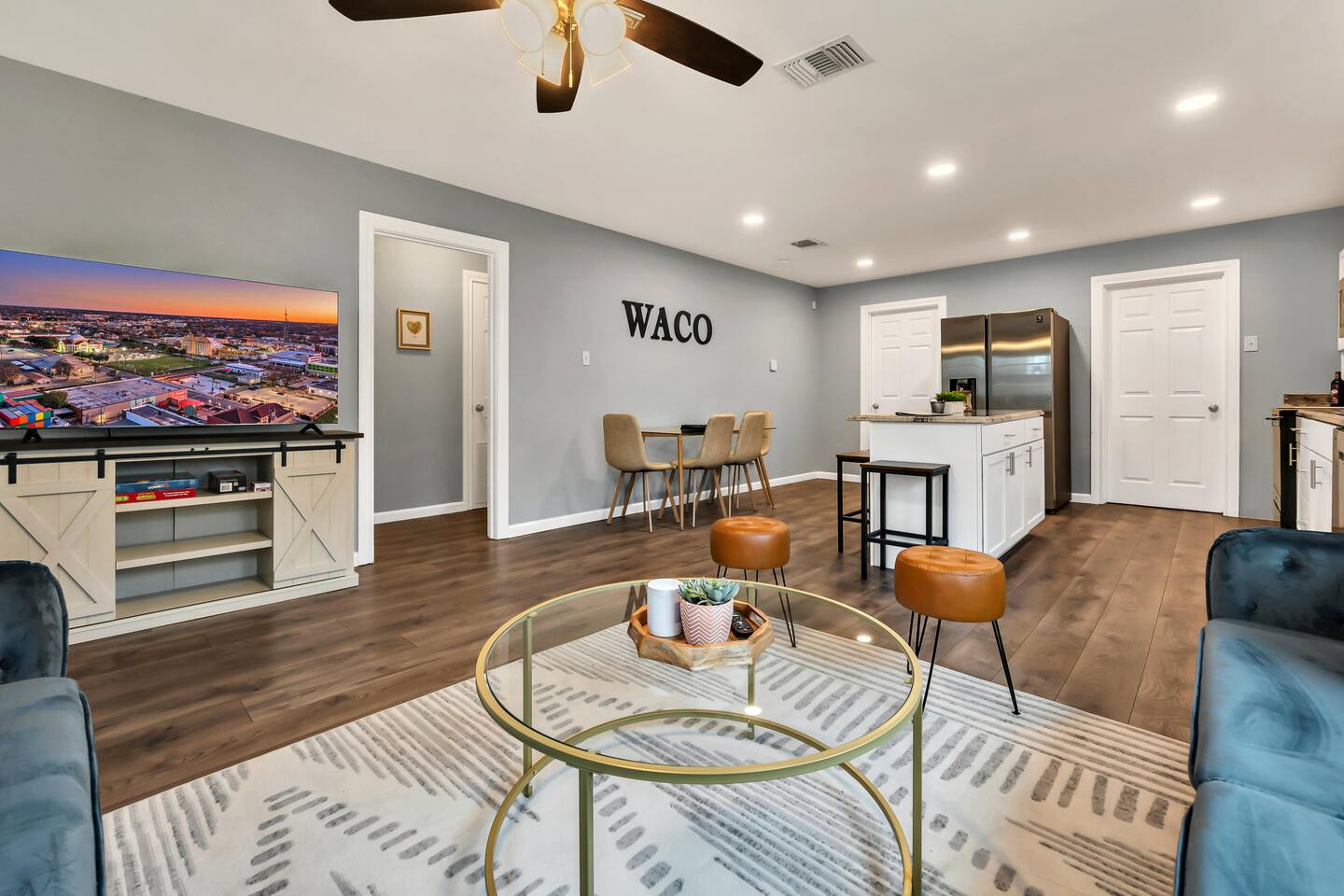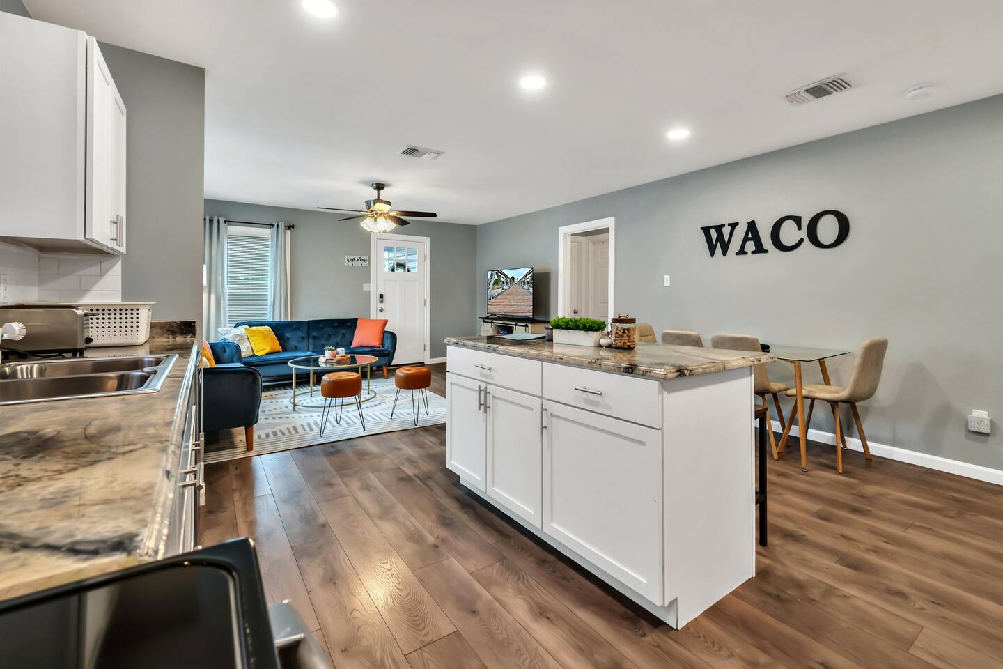 Welcome to The Waco Charmer! This cozy home is close to all the popular attractions while being tucked away in a quiet neighborhood to escape the city noise. Inside you'll find comfy beds and a beautiful open-concept full kitchen and living room to watch all your favorite Sling/Netflix shows. Step out back to enjoy the fully fenced yard equipped with a string lit gravel patio, charcoal grill, fire pit, and cornhole. We are also pet-friendly so your fur babies are welcome to tag along with you!